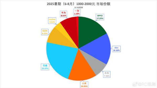 【CNMO科技消息】近日,有数码博主曝光了国内1000元-2000元市场份额数据。2025年6月到8月,vivo(含iQOO)以领先亚军不到两个百分点拿下第一,而荣耀与OPPO(含一加)则分别以22.87%、18.27%占据第二以及第三。